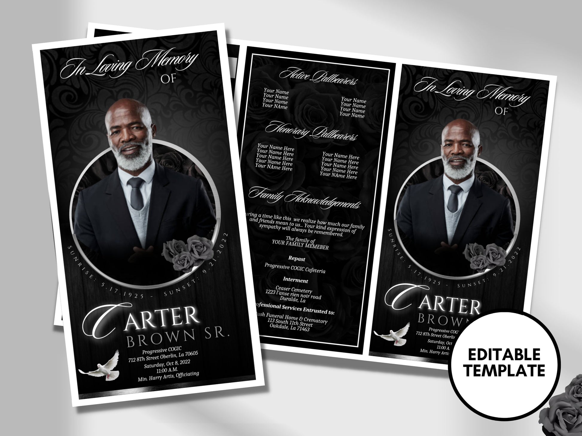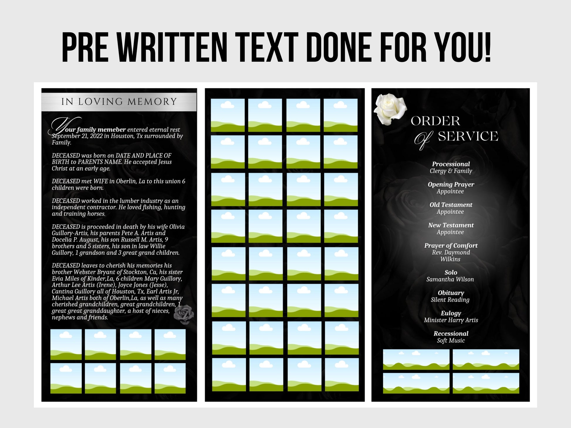 Create a fitting and memorable tribute to your loved one with this creative Funeral Program Canva Template. Order now and receive instant access to the template after purchase.