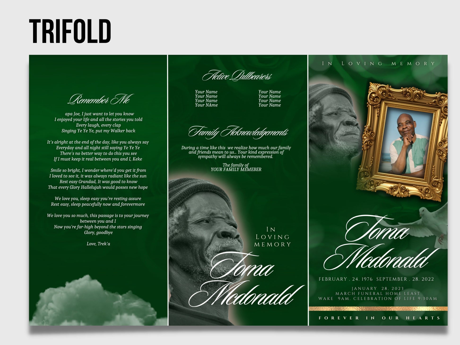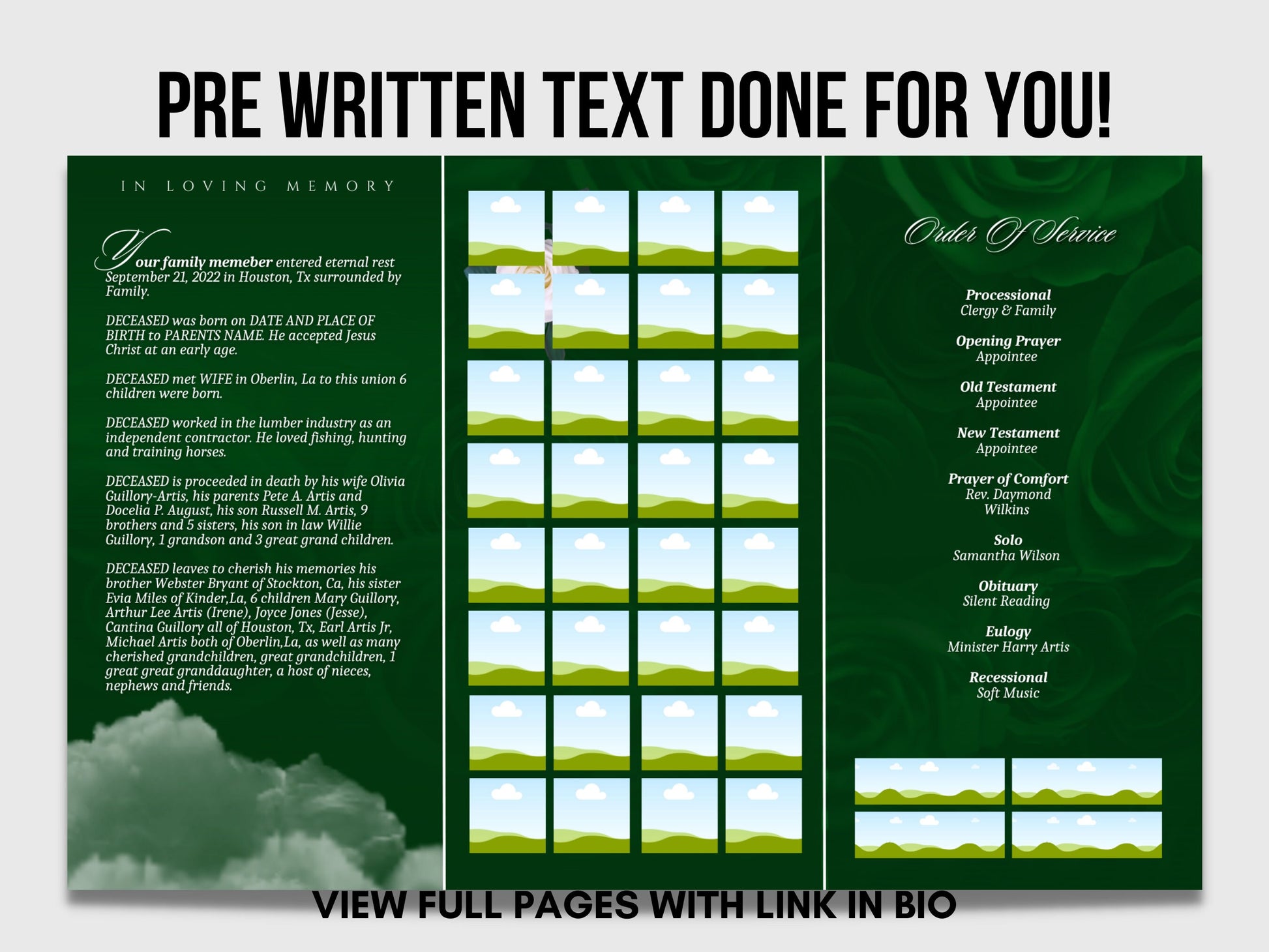 17"x11" FUNERAL OBITUARY TEMPLATE (2 pages) |Elegant Style Funeral Program | Celebration of Life |Unisex green Obituary |Canva Template