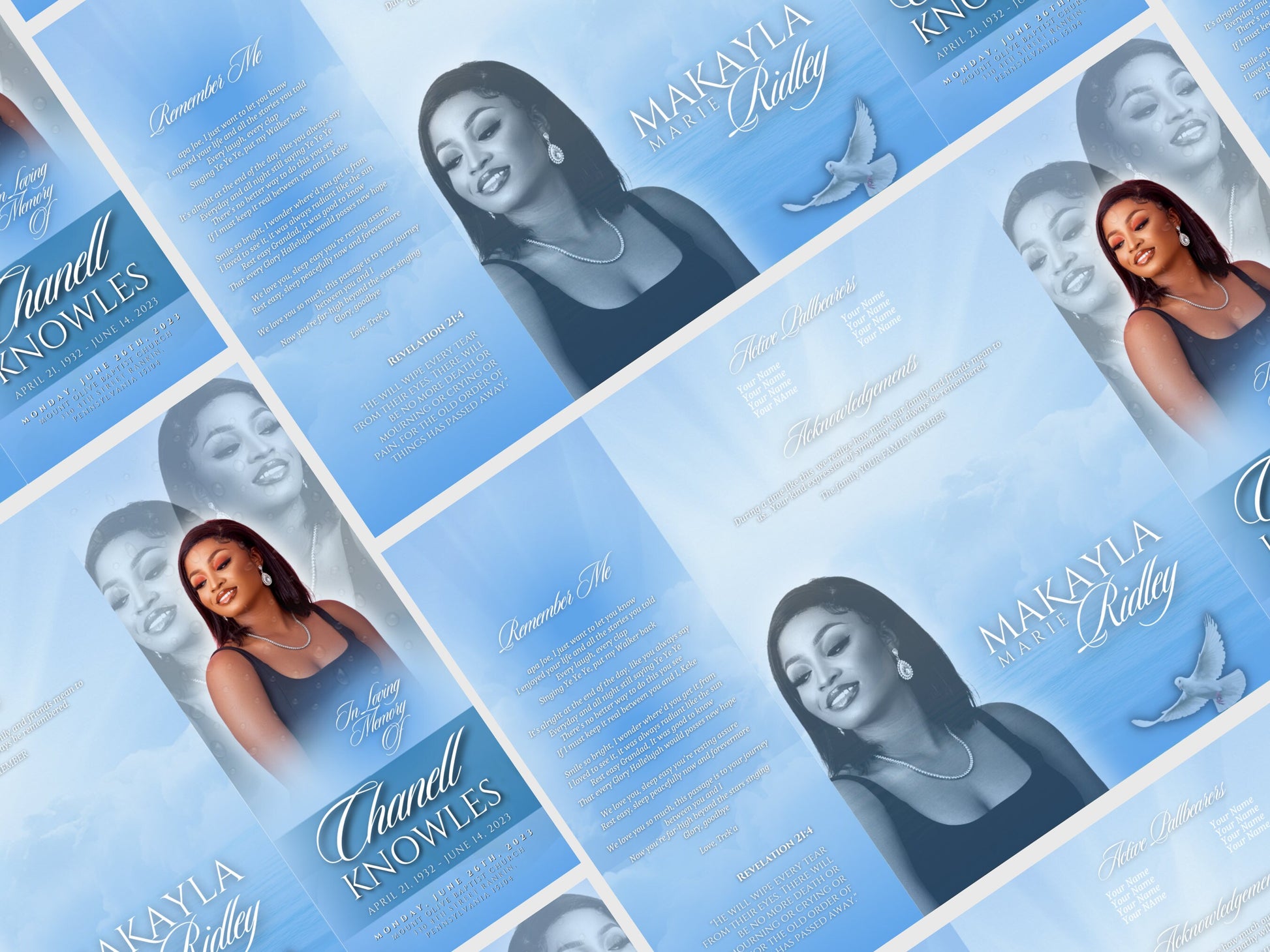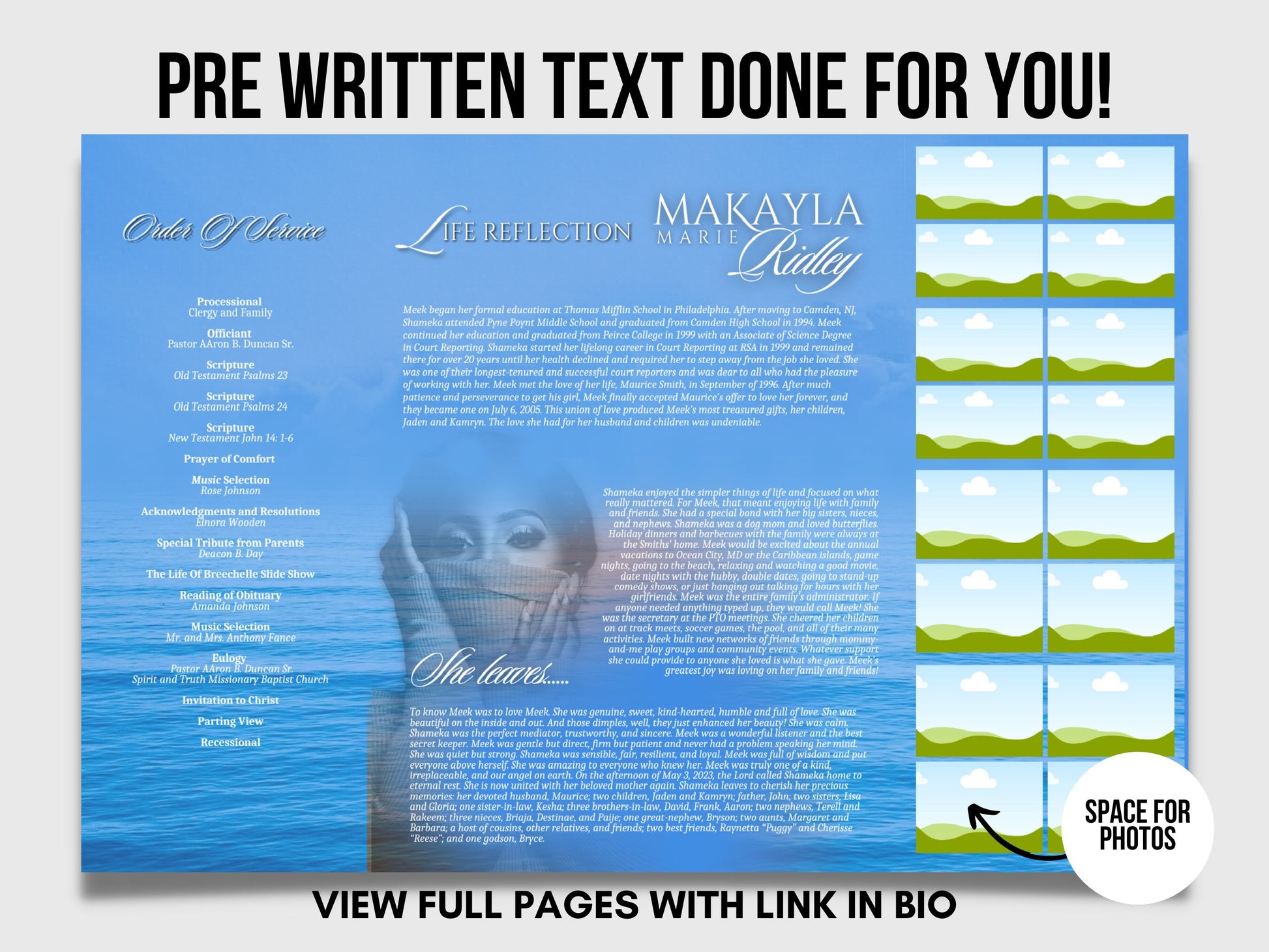17"x11" GATEFOLD Memorial program| Blue and White Funeral Program |Celebration of Life |Keepsake |Digital Download |Canva Template