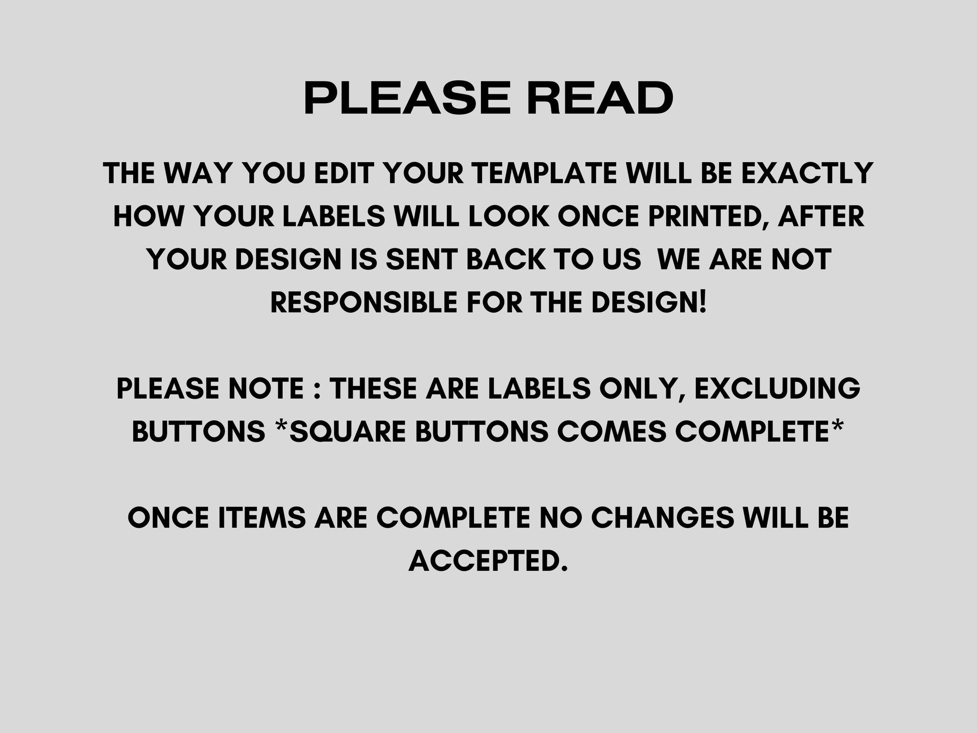 PLEASE NOTE : THESE ARE LABELS ONLY, EXCLUDING BUTTONS *SQUARE BUTTONS COMES COMPLETE*