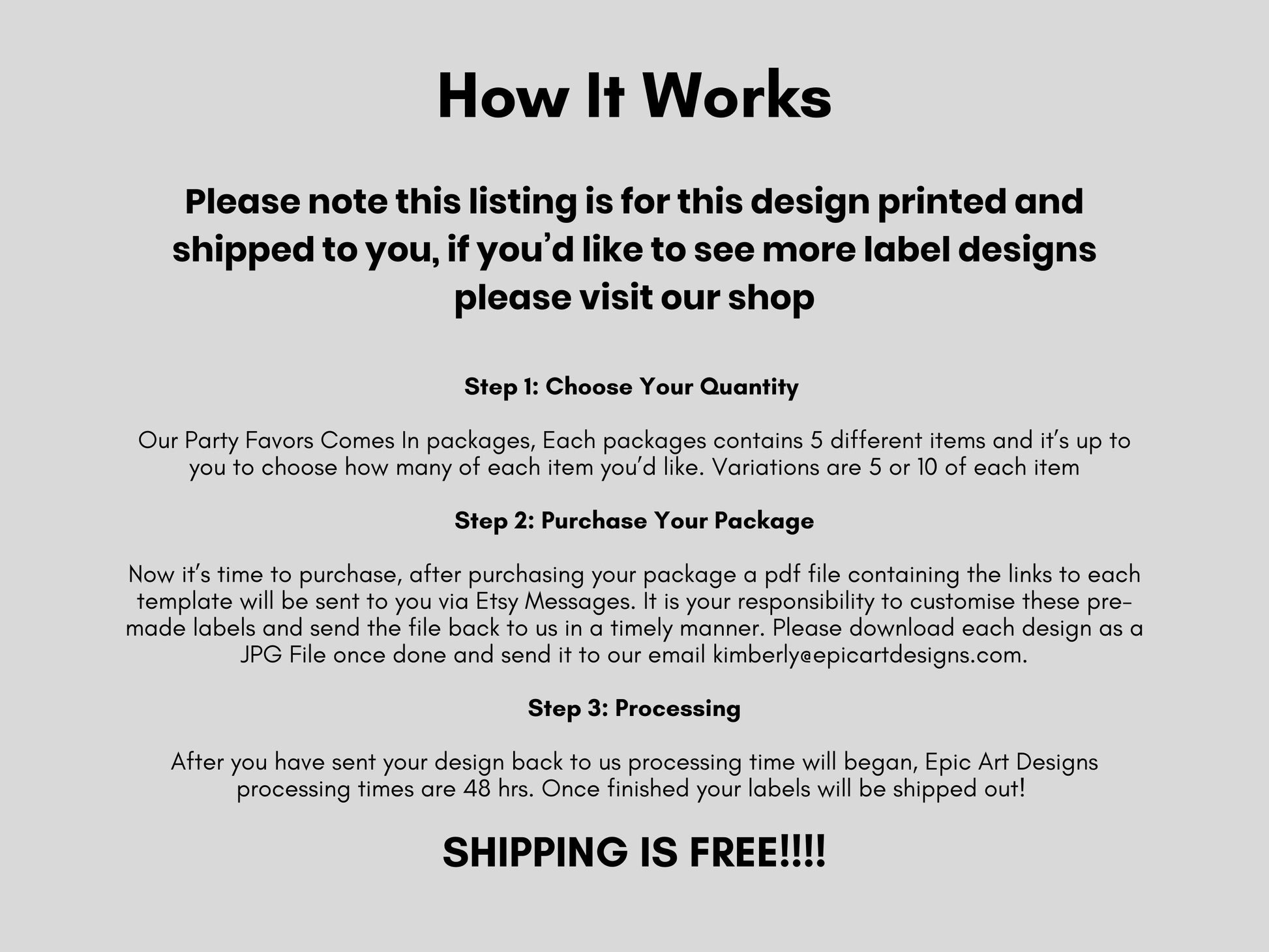 Now it’s time to purchase, after purchasing your package a pdf file containing the links to each template will be sent to you via Etsy Messages. It is your responsibility to customise these pre-made labels and send the file back to us in a timely manner. Please download each design as a JPG File once done and send it to our email kimberly@epicartdesigns.com.
